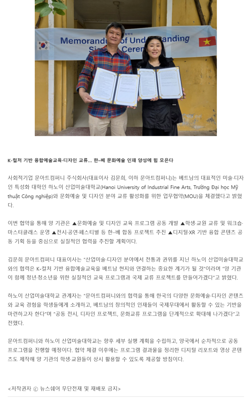[뉴스쉐어] 문아트컴퍼니, 베트남 하노이 산업미술대학교와 문화예술·디자인 교류 업무협약 체결