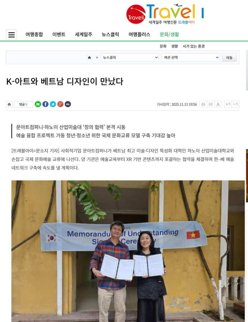 트래블아이에 보도된 문아트컴퍼니 하노이 산업미술대학교 업무협약 체결 소식