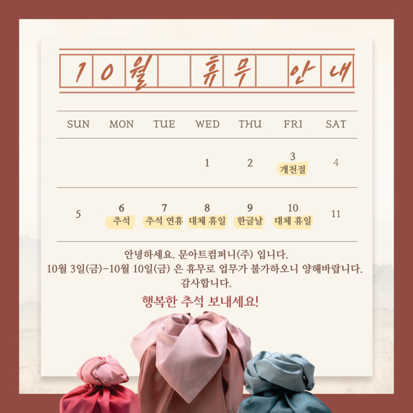 공지사항 문아트컴퍼니(주) 10월 추석&개천절 휴무 안내
