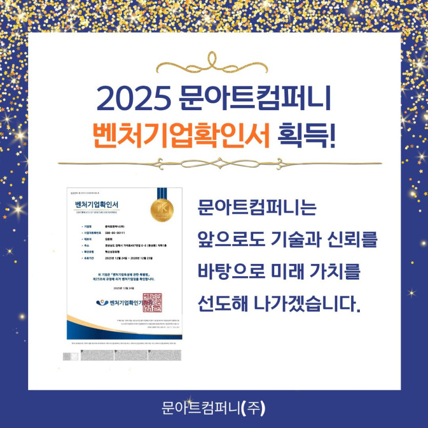 문아트컴퍼니가(주) 2025 벤처기업확인서를 획득했습니다.