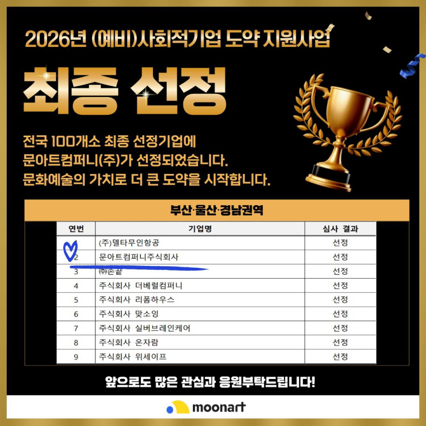 공지 공지사항 문아트컴퍼니(주), 2026년 (예비)사회적기업 도약 지원사업 최종선정!